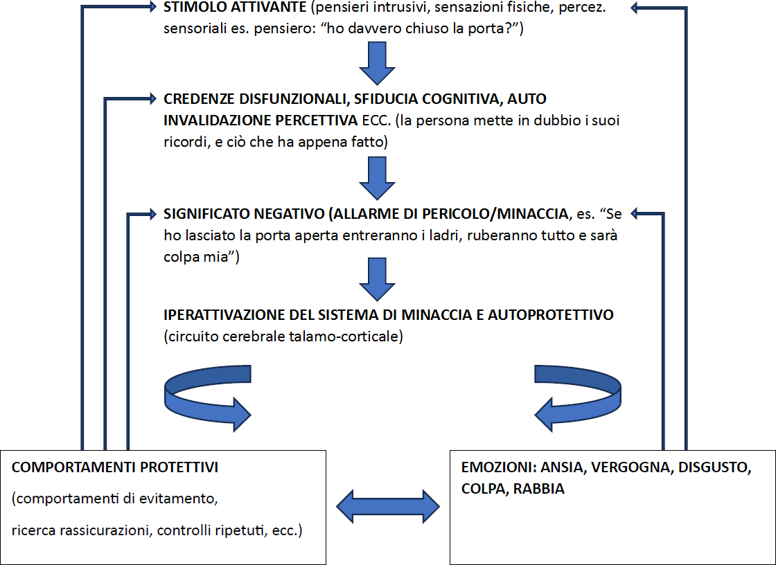 Tutti questi sintomi possono variare nella loro intensità e gravità, in alcuni casi producono solo poca ansia, in altri possono arrivare a produrre ansia e/o colpa elevata con gravi menomazioni nella vita della persona. Un esempio grafico di cosa accade (modello cognitivo evoluzionista del DOC, Didonna 2022) e di come si mantiene il disturbo: